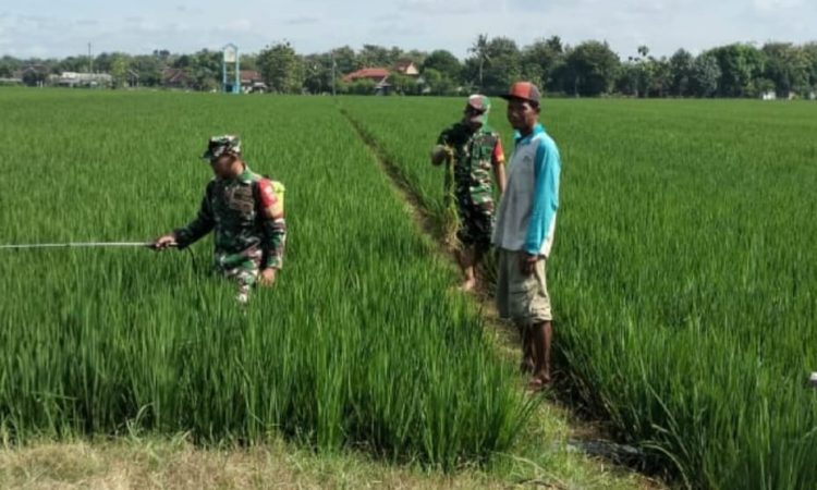 Serma Tri Hartono bersama dengan kelompok tani Muji Rahayu bahu-membahu menyemprotkan insektisida pada tanaman padi yang mulai menunjukkan gejala serangan hama.