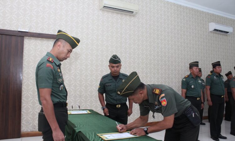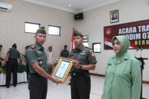 Jabarexpose.com._Boyolali.-. Suasana haru namun penuh kebanggaan menyelimuti Aula Makodim 0724/Boyolali saat Komandan Kodim 0724/Boyolali Letkol Inf Dhanu Anggoro Asmoro, S.E. memimpin acara korps raport pindah satuan bagi salah satu Perwira terbaiknya, Kapten Inf Kamami, Senin (27/10/25).