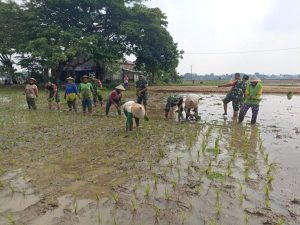 Para anggota Koramil terlihat bahu-membahu dengan para petani menanam padi di sawah. Mereka bekerja dengan semangat dan penuh keakraban, menciptakan suasana gotong royong yang hangat.