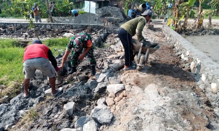 Jabarexpose.com._Sragen.- Serda Supriyano, Babinsa Desa Kalimacan Koramil 18/Kalijambe Kodim 0725/Sragen yang berdedikasi tinggi terhadap kesejahteraan masyarakatnya, mengajak seluruh warga desa untuk bergotong-royong membangun talud jalan yang rusak, Rabu ( 03/07/2024 ).